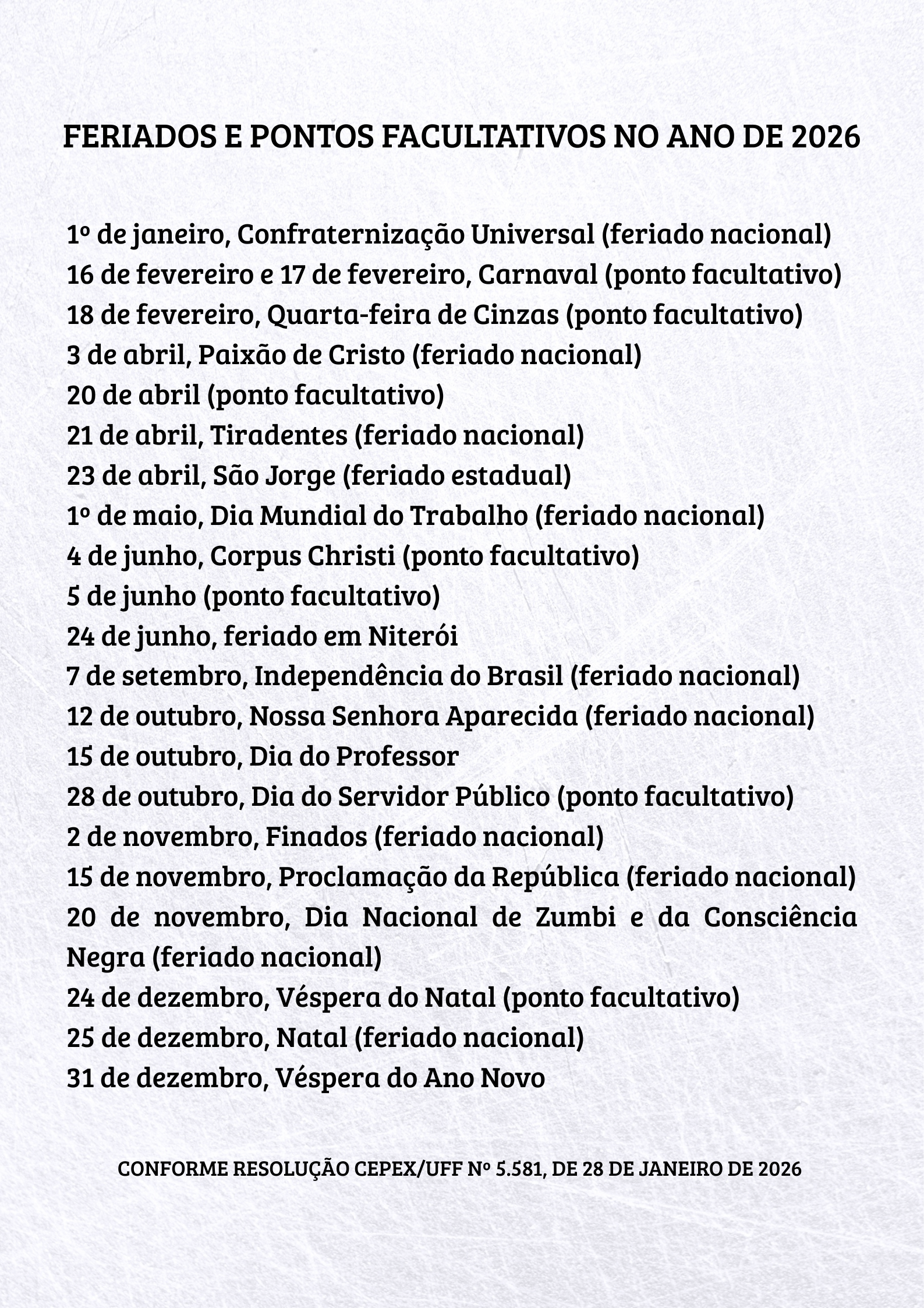 Feriados adotados pela Universidade – Calendário 2026